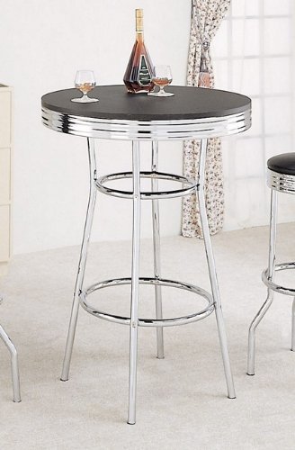 Go back in time with the fun and distinctive styling of the Cleveland collection. Retro chrome plated tables, chairs, and bar stools create a unique 1950's diner appeal. With a number of different looks, the Cleveland collection will make a wonderful addition to your pub room, game room, or casual dining spaces. Rewind time and create an entertaining dining experience with the retro designs of this 50's soda fountain bar table. The round top in a black finish, rippled chrome rim, and chrome single pedestal compose a distinctive look. Pair with the coordinating chrome plated pub stools for a complete 1950's diner appeal! Features: Smooth black finished top with chrome trim Round shape Chrome rimmed tops, legs, and pedestals Casual style30" diameter table topPair with the 2408 Coaster Bar Stool from the same collection to complete your set! Specifications: Overall Dimensions: 41.75"H x 30"W x 30"D Product Weight: 28 lbs